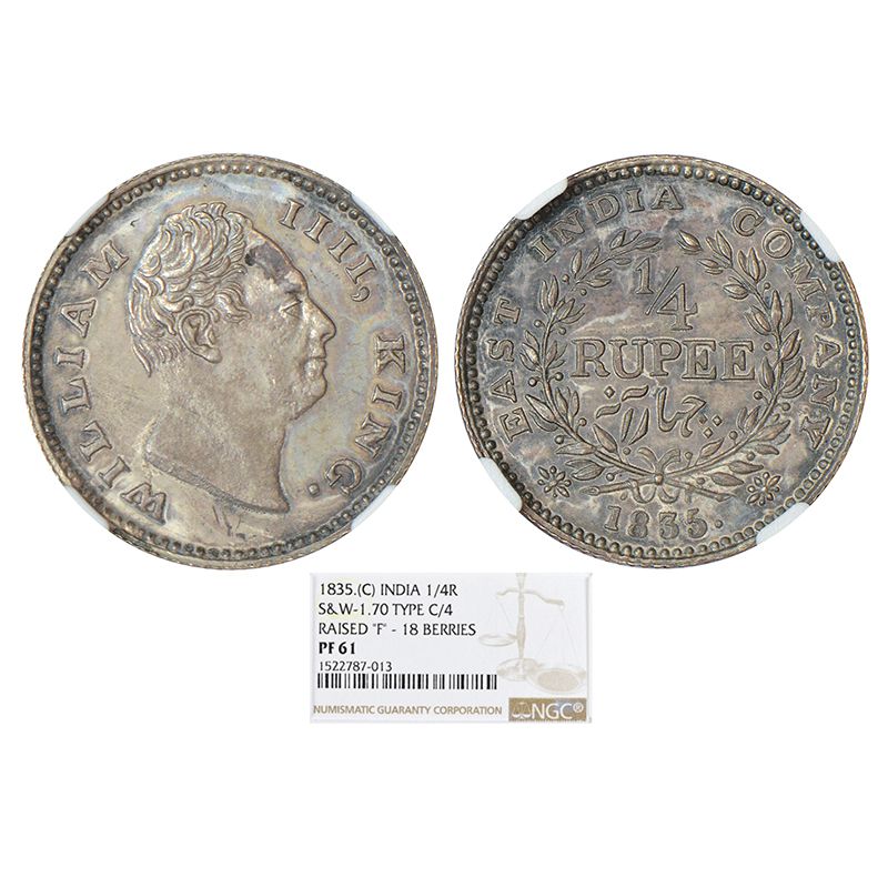 William IV, silver ¼ rupee, Proof, 1835, Calcutta mint, letter 'F' in relief, 18 berries, type C/IV, dot after date, S&W 1.70; PR 92.