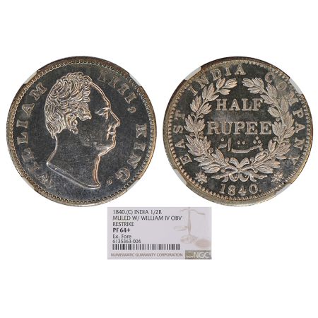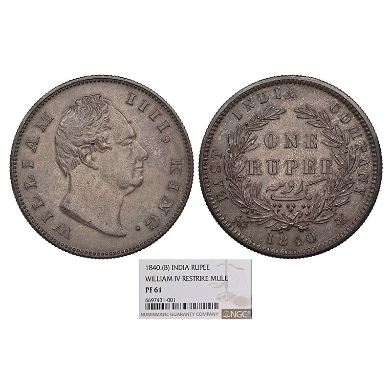 William IV, silver rupee, Mule, proof restrike, 1840, Bombay mint, letter 'F' in relief raised on truncation, S&W 1.49a; This coin features the obverse of William rupee paired with the reverse of an 1840 rupee, produced for Victoria.