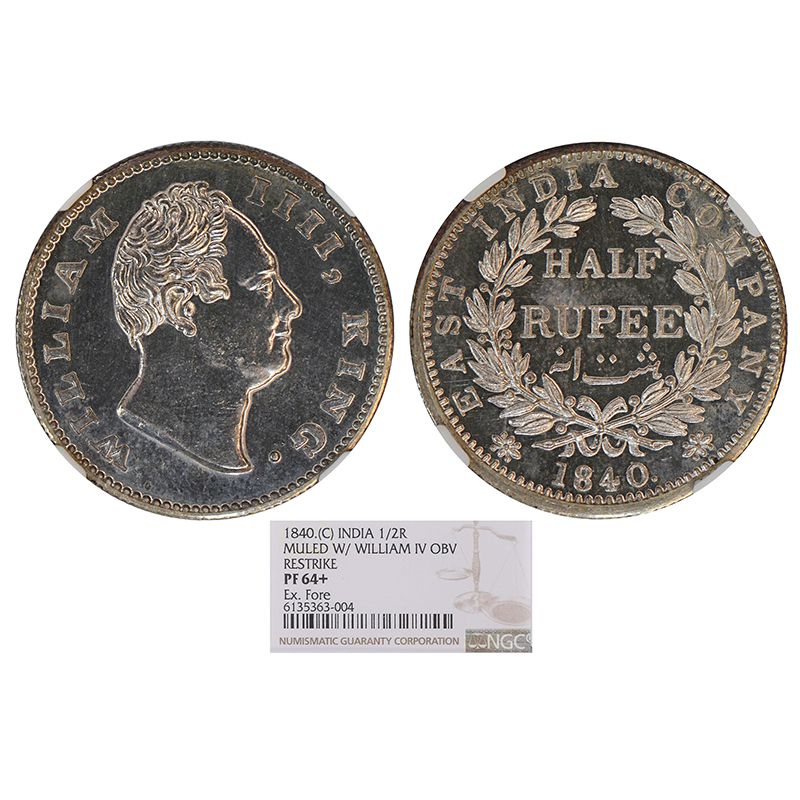 William IV, silver ½ rupee, Mule, proof restrike, 1840, Calcutta mint, letter 'F' in relief raised on truncation, 19 berries, unlisted in S&W and PR. This coin features the obverse of a William ½ Rupee paired with the reverse of an 1840 ½ Rupee, produced for Victoria.