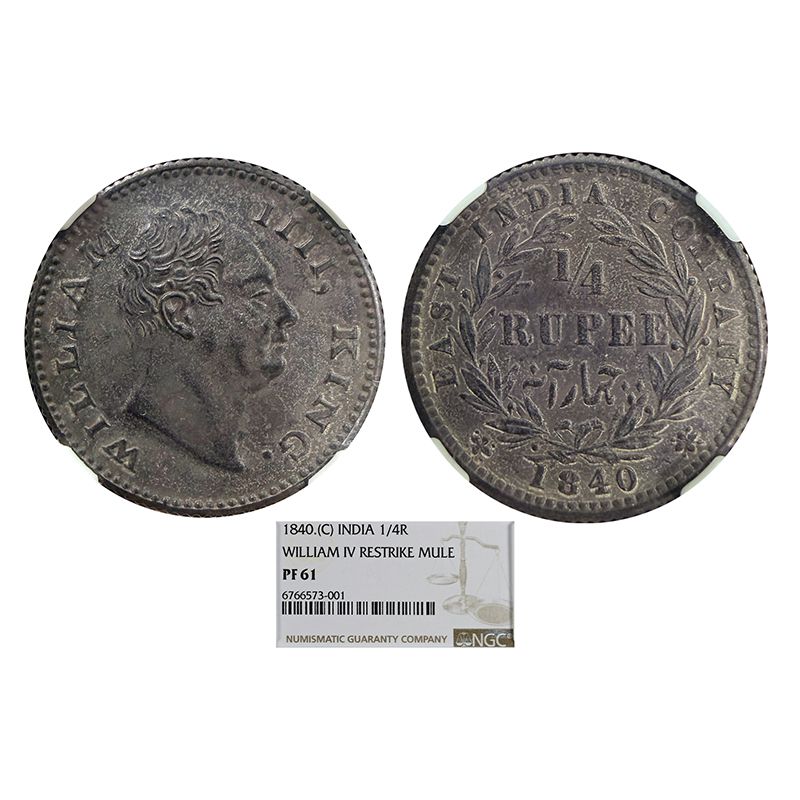 William IV, silver ¼ rupee, Mule, proof restrike, 1840, Bombay mint, letter 'F' in relief raised on truncation, 10 berries, plain '4' in date, no dot after date, S&W 1.71, unlisted in PR. This coin features the obverse of a William ¼ rupee paired with the reverse of an 1840 ¼ rupee, produced for Victoria.