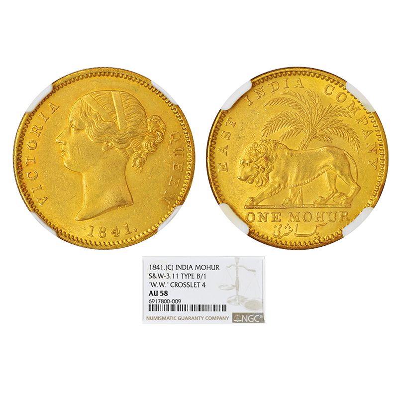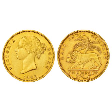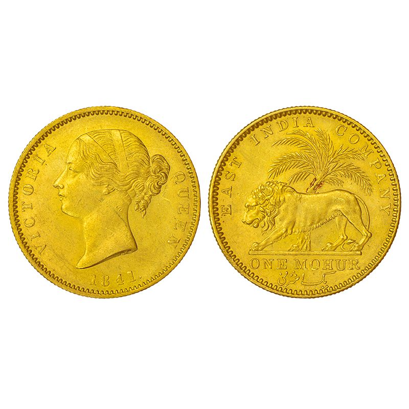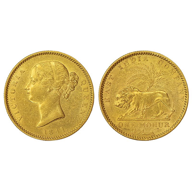 Victoria Queen, divided legend, gold mohur, 1841, Calcutta mint, W.W. incused, Serif '4', type B/I, S&W 3.11; PR 22. Obv: Portrait bust of queen facing left; W.W. incused on truncation and date with serif 4. Rev: Lion walking left with a palm tree above; denomination in English and Persian below.