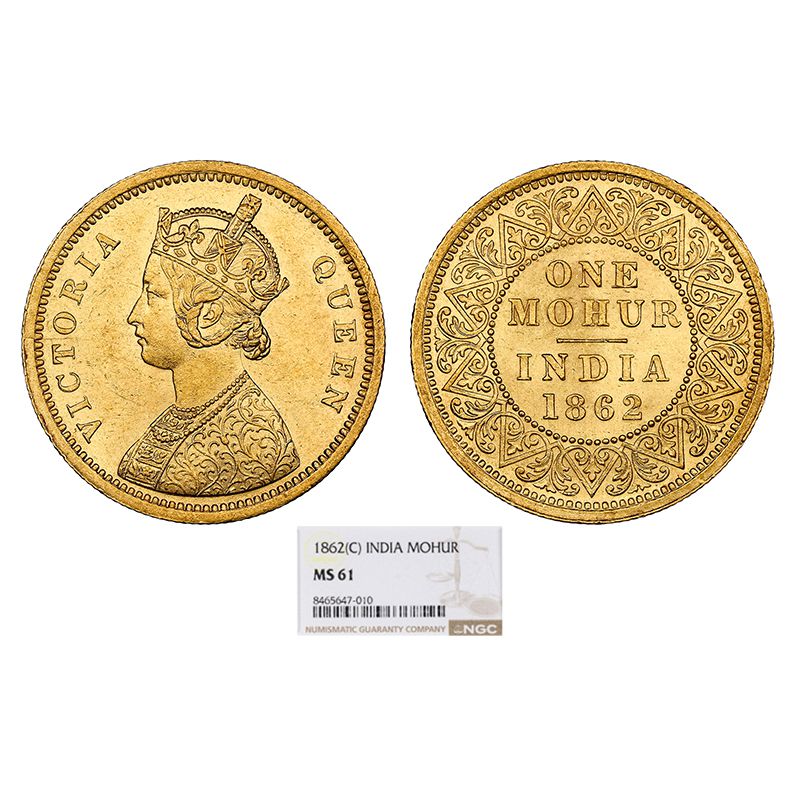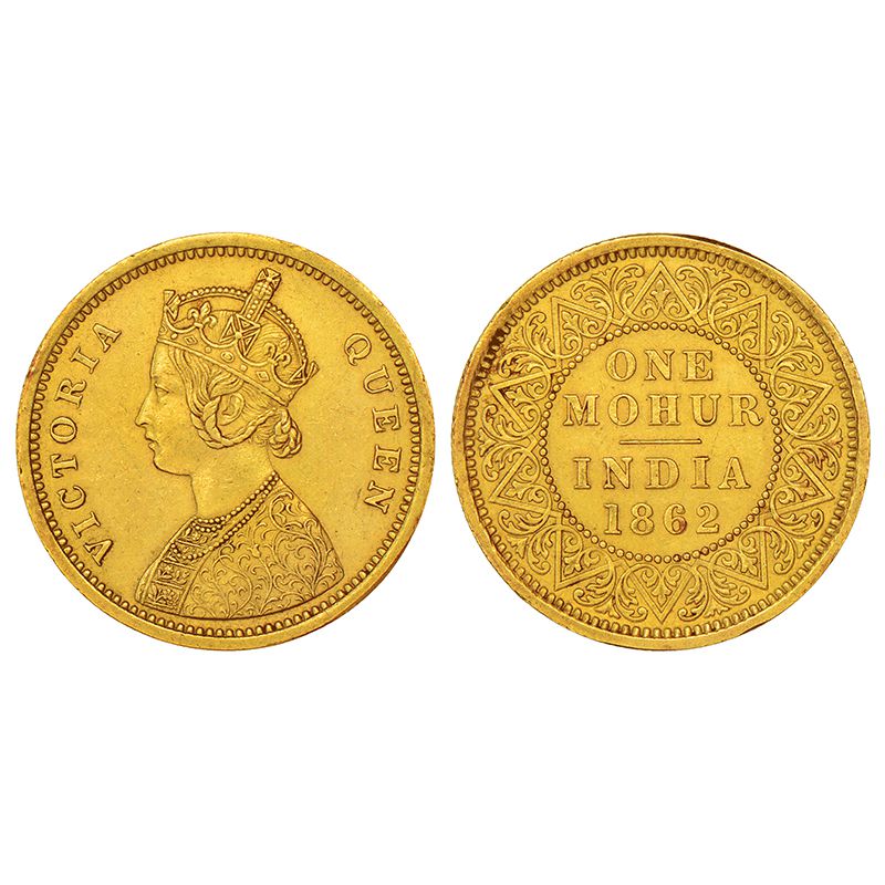Victoria Queen, gold mohur, Calcutta mint, 1862, single flower in bottom panel of Jabot on obverse, S&W 4.1; PR 1.