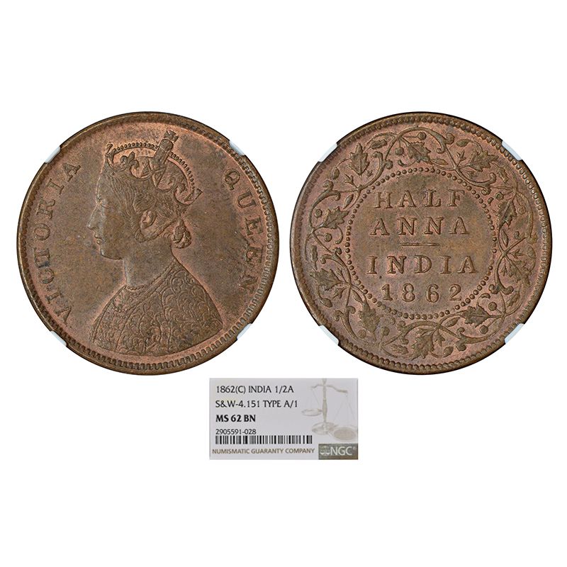 Victoria Queen, copper ½ anna, 1862, Calcutta mint, type A/1, S&W 4.151; PR 576.