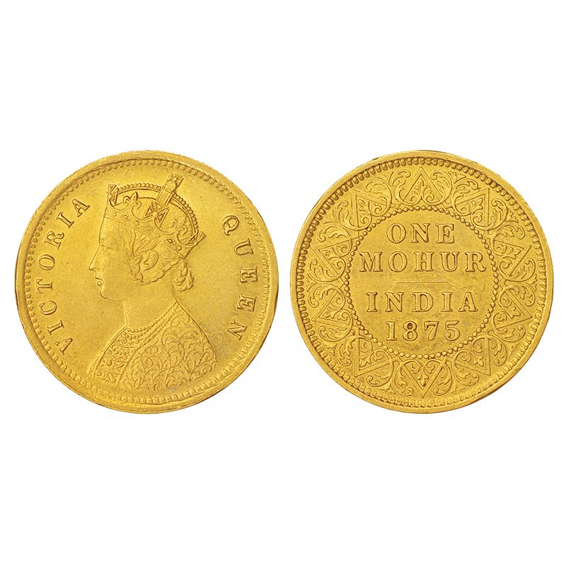 Victoria Queen, gold mohur, 1875, Calcutta mint, two flowers in bottom panel and 'V' in relief, S&W 5.1; PR 13, 11.62g.