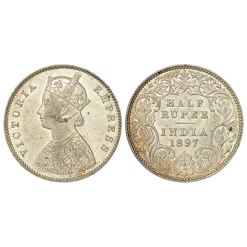 Victoria Empress, silver ½ rupee, 1897, Calcutta mint, 4 panels in jabot on obverse, A/I/'C' incused, PR 280; GK 657, 5.81g.