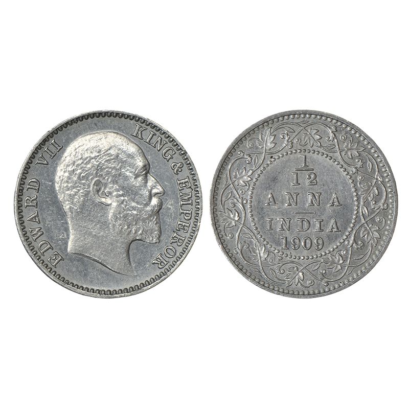 Edward VII, aluminium proof 1/12 anna, 1909, Calcutta mint, S&W 7.229; Pridmore, p.197; 0.54g. Obv: Bare head of the king facing right. Rev: Date and denomination within a beaded circle; surrounded by serpentine wreath.