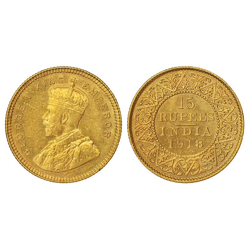 George V, gold 15 rupees, 1918, Bombay mint, S&W 8.1; PR 25, 7.98g. Obv: Crowned bust of the king facing left. Rev: Date and denomination within a beaded circle.
