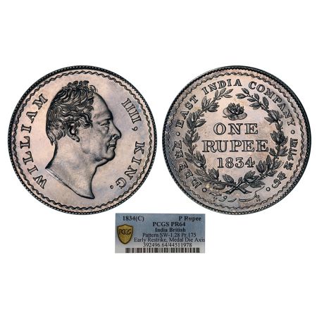 William IV, silver 'Proof Pattern' rupee, early restrike, type 5, 1834, Calcutta mint, milled edge, S&W 1.28; PR 175 Obv: Portrait bust of king facing right, surrounded by the lettering of the Legend “WILLIAM IIII, KING.” enclosed in a wavy circle; surrounded by a toothed border. Rev: In center, Denomination “ONE RUPEE” in English with a lotus flower above and date below, surrounded by a wreath of laurel; with the legend “EAST INDIA COMPANY” above; Hindi, Persian, and Bengali values below the wreath, all enclosed in a wavy circle surrounded by a toothed border.