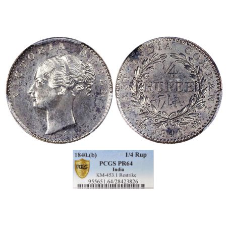 Victoria Queen, continuous legend, silver ¼ rupee, proof restrike, 1840, Bombay mint, English head, 20 berries, type A/II, no curl on cheek, unlisted in S&W and PR.