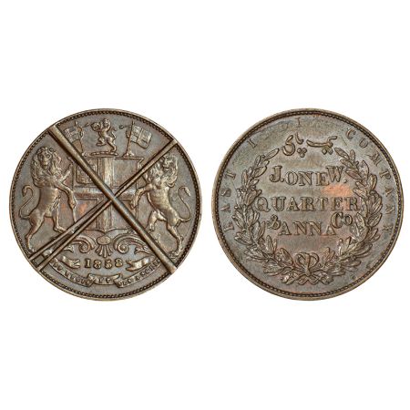 East India Company, defaced trial copper ¼ anna, 1858, a machine trial by J. Watt & Co. Birmingham, S&W 3.83; PR 158, 6.52g. Obv: Arms of the company, with date below; die-defaced. Rev: Denomination in Persian and English; 'J' 'W' '&’ (inverted) 'Co', all within a wreath of laurel.