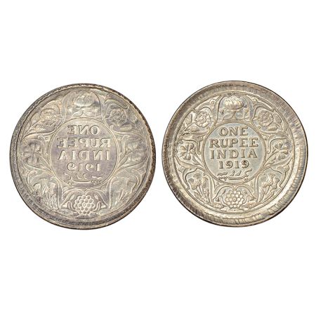 George V, silver rupee, 1919, Bombay mint, dot, plain edge, beautiful mint error, broadly struck with reverse part full brockage ( Lakhi) with complete die impression on obverse, 32.65mm, 11.62g.