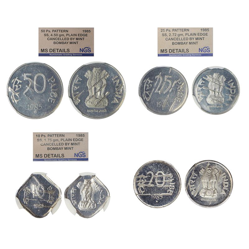 1985, set of 4 pattern coins in stainless steel, 50 paise, 25 paise, 20 paise and 10 paise, Bombay mint, Diamond mint-mark. Obv: Denomination and date. Rev: Ashoka emblem. This design was officially cancelled by mint and never introduced into circulation.