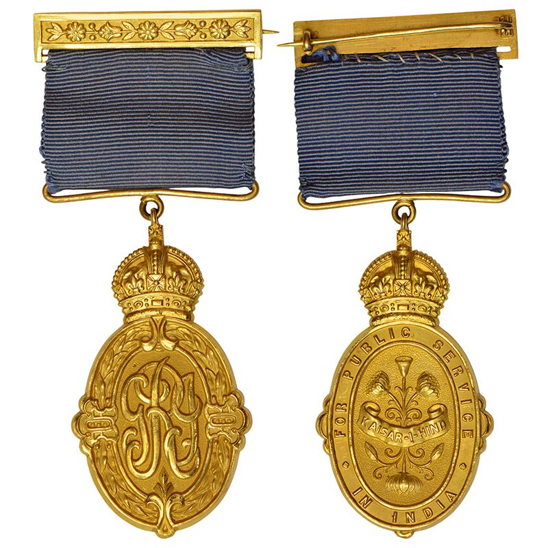 This first-class issue in gold medals were awarded to civilians of any nationality who rendered distinguished service in the advancements of the interests of British India. The Gold medals were awarded directly by the monarch on the recommendation of the Secretary of State for India. The title Kaiser-i-Hind literally translates to emperor of India, and was issued under the aegis of every monarch who ruled India, being created in 1900 and lasting until the end of the British Raj in 1947.