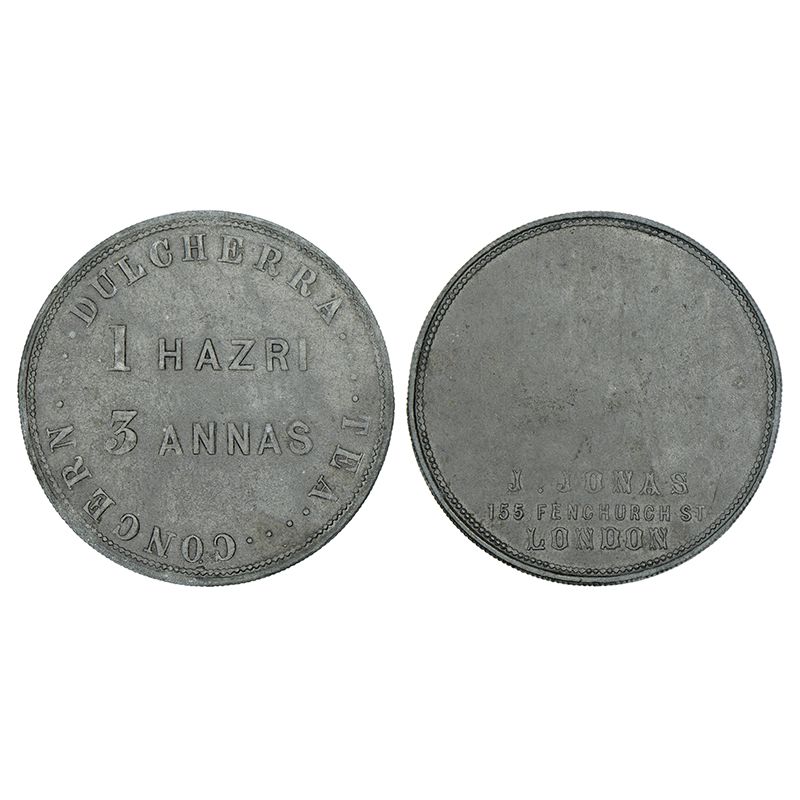 Dulcherra tea gardens - zinc/tin token for one day's work (1 Hazri) worth 3 Annas, made in England by J. Jonas & Co., 155, Fenchurch Street, London; unlisted in Pridmore and Puddester, 45.55mm, 17.50g.
