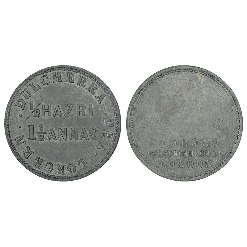 Dulcherra tea gardens - zinc/tin token for ½ day's work (½ Hazri) worth 1.5 Anna, made in England by J. Jonas & Co., 155, Fenchurch Street, London; unlisted in Pridmore and Puddester, 38.45mm, 12.94g.