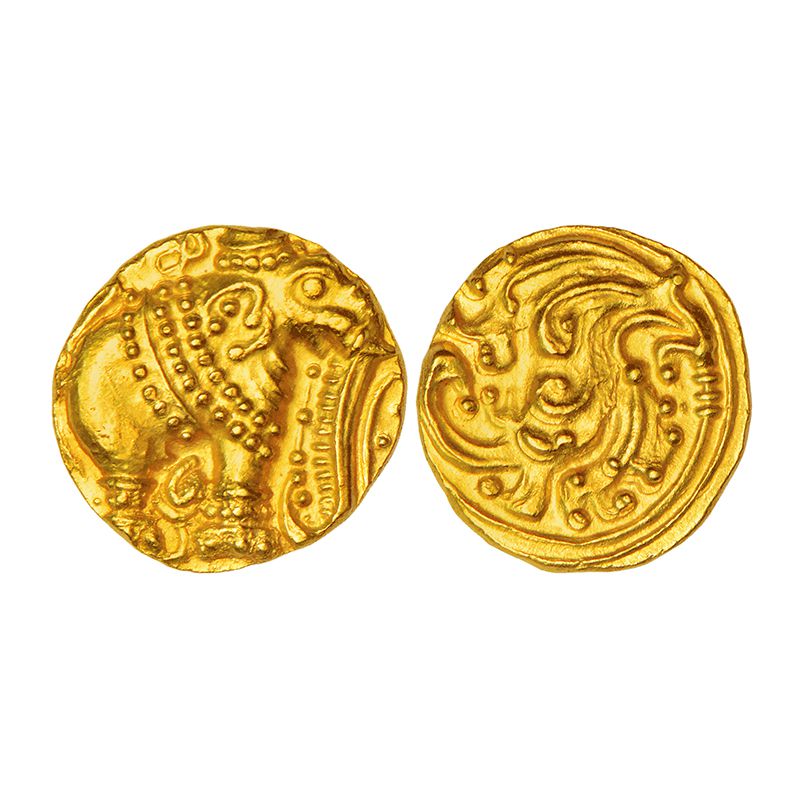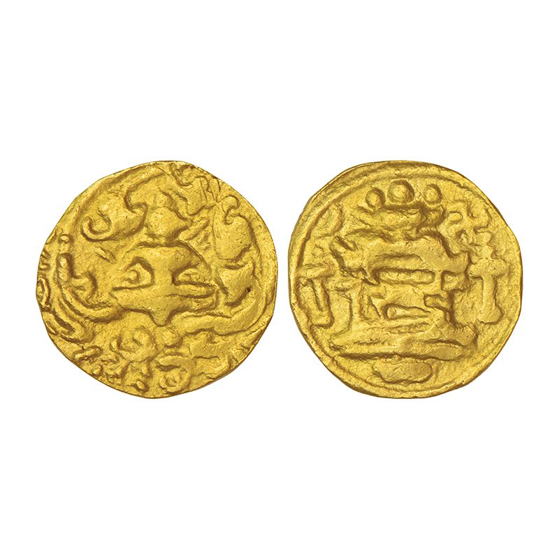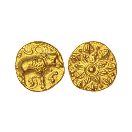 Seated Garuda was the dynastic emblem of the Rashtrakutas and hence the attribution of this coin. The design is derived from Gadyanas of Ganga and Kadamba dynasties and therefore it can be surmised that the coin must have been struck towards the end of the Rashtrakuta dynasty, perhaps issued by later rulers such as Indra III (c. 914-928) or Govinda IV c. 940-960).
