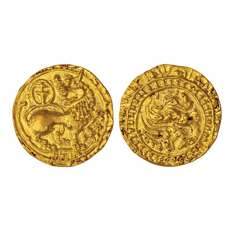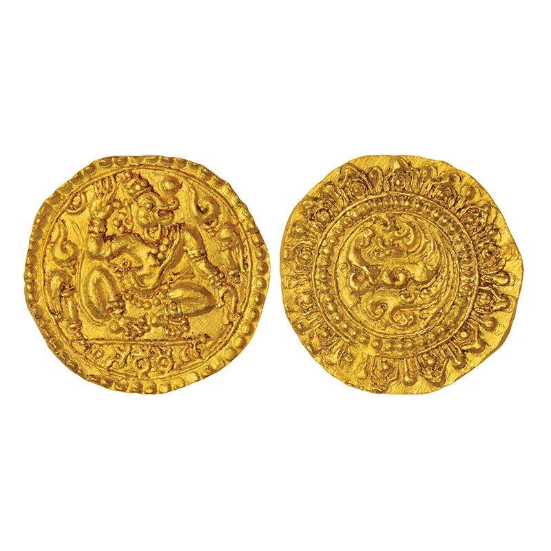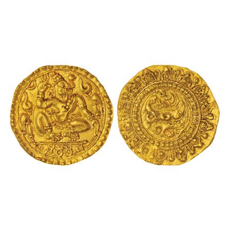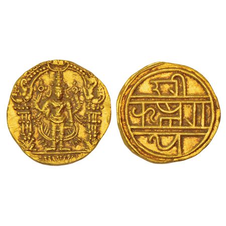 Virasimha was the first known ruler of the Tomara dynasty of Gwalior. His rise to power is dated to the second half of 14th century and he was granted Gwalior by the later Tughlaq Sultans of Delhi. The attribution of the coin to him is tentative but fits the very end of the 'Lakshmi'-type gold coinage of North India with the goddess being replaced by her male counterpart, Kubera.