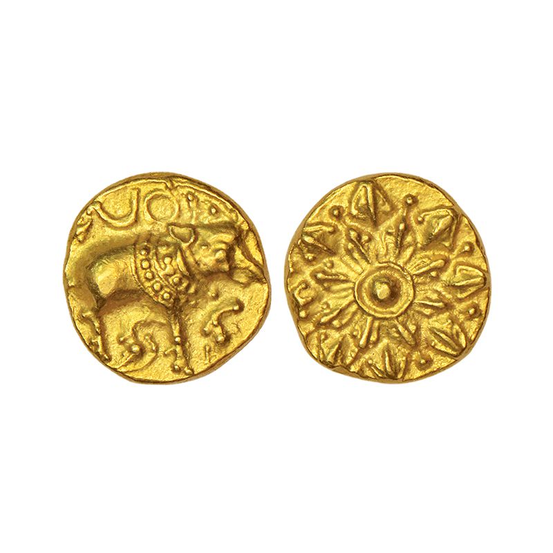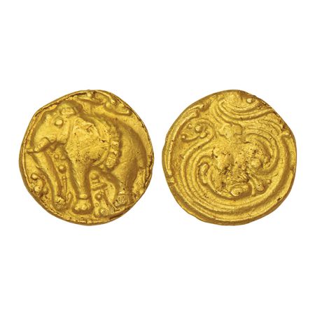 Western Gangas (10th-11th century AD), gold gajapati pagoda, 13.76mm, 3.84g. Obv: An ornate elephant standing facing left, there is a pearl garland on the neck of the elephant. Rev: Ornamental floral scroll. Among this series, the left-facing elephant variety is far rarer than the right-facing type.