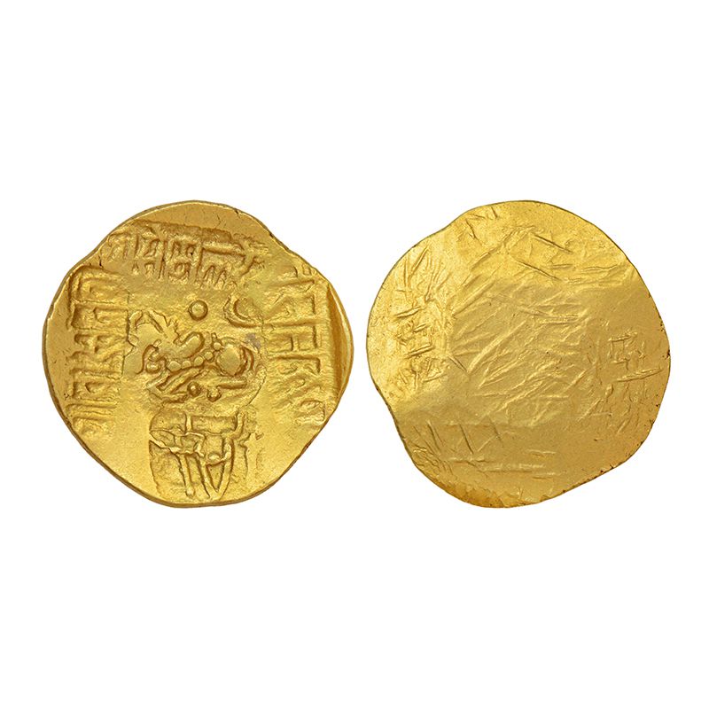 The Kadambas of Hangal were a prominent medieval dynasty in Karnataka, ruling as feudatories under the Western Chalukyas. The dynasty developed multiple branches, including those of Hangal, Bankapur, and Goa, and played an important role in the political landscape of 11th–12th century Karnataka. Their coin designs belong to mainly two distinct classes. They depict either the Kadamba Lion emblem (as shown in previous lot), or else show Hanuman and cite Nakareshvara, the principal diety of their temple at Bankapura, situated 15 miles northeast of Hangal. These coins, with their high gold purity, refined artistry, and striking iconography, places them among the finest medieval South Indian gold issues.
