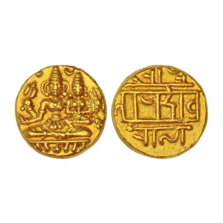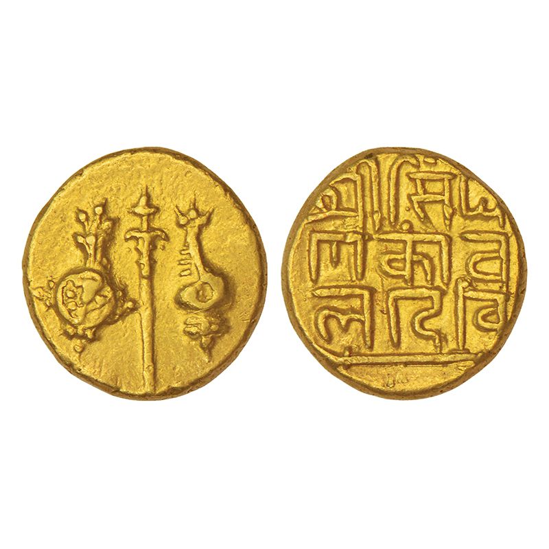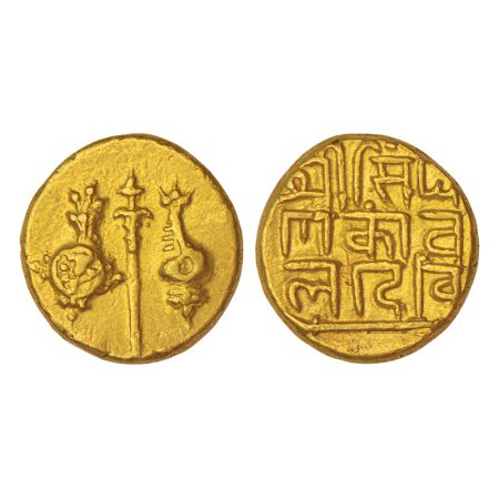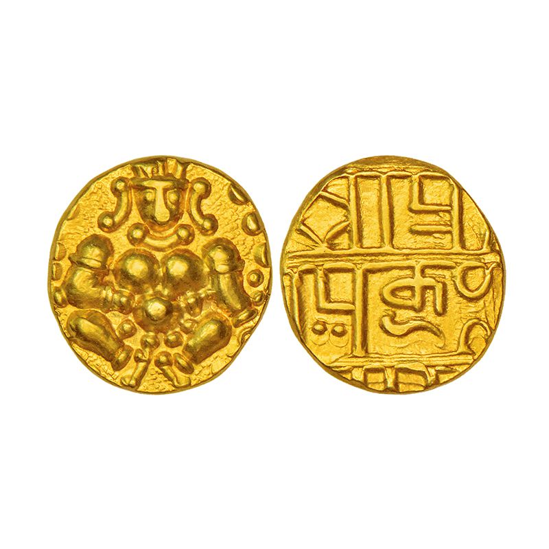 This exceedingly rare and important coin was specially struck by Krishnadevaraya in 1516 AD, to perform a Kanakabhishekam (“Shower of Gold”) ceremony at the Tirupati temple, to thank the Lord for his victory over the Kondavidu and Gajapati dynasties of neighboring Andhra-Orissa country. It shows a truly splendorous depiction of Venkateshwara, in all its jewelled glory on obverse. As compared with it the simplicity of the reverse stands out as a testimony to the King's devotion and subservience to the Lord.