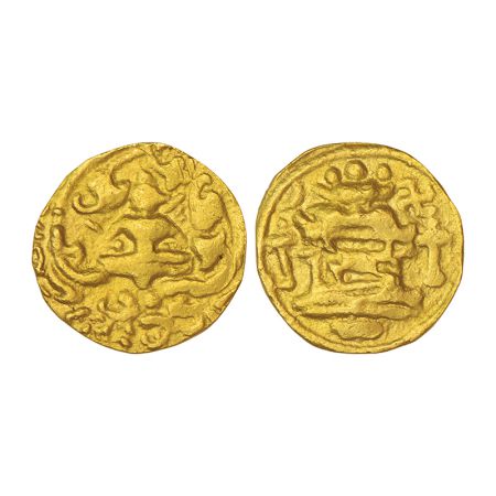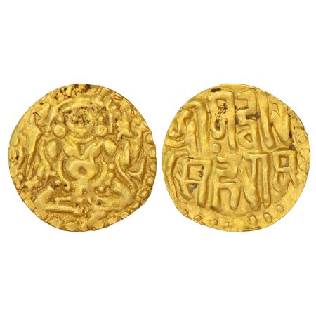 Tomaras of Gwalior - gold ½ dinar of Virasimha (c.1350-1400), unpublished in major sources, 20.62mm, 3.60g. Obv: Kubera seated cross-legged in a frontal manner holding a danda in right hand and a lotus in left. Rev: Nagari legend in two lines Shri Madveera / Simha Rama.