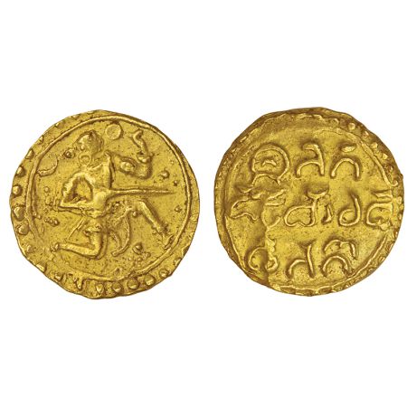 Kadambas of Hangal, gold gadyana or varaha, in the name of Nakareshwara, the patron deity of Bankapur (1100-1200 AD), MCSI-I 229, 19.36mm, 4.22g. Obv: Hanuman seated in Veerasana, with head right, holding a hand up in attacking position, chowry and sankh on each side; Kannada legend 'Nakara' in exergue. Rev: Elaborate ornamental floral scroll within a rayed-lotus border.