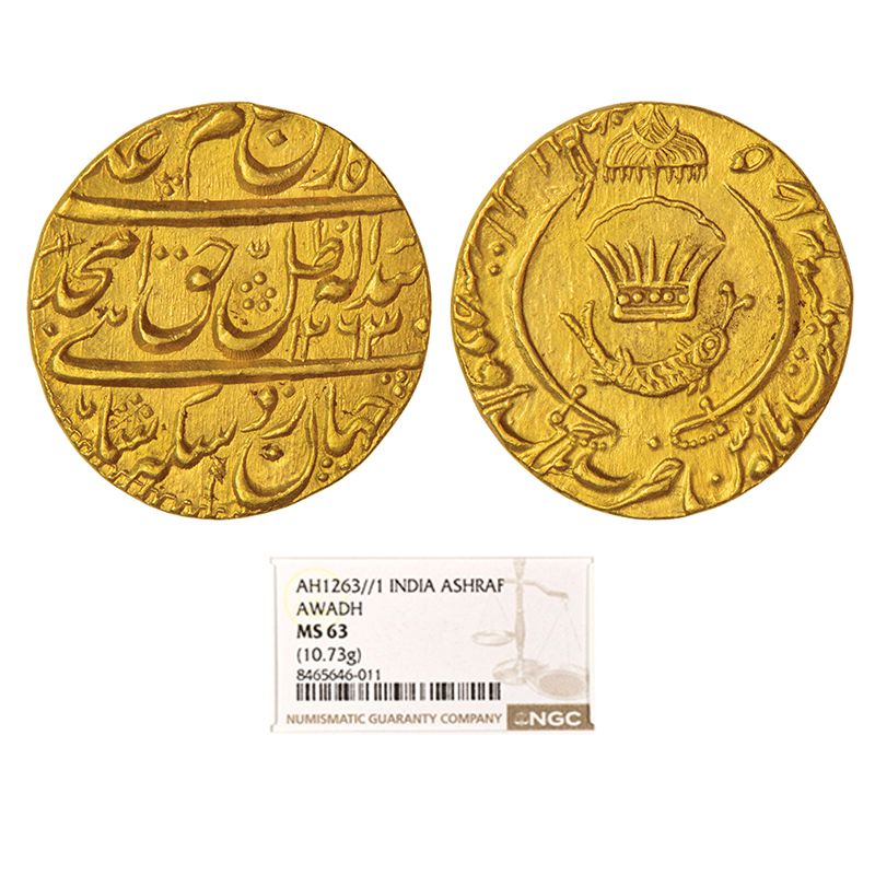Awadh, Amjad Ali Shah (1842-1847 AD), gold ashrafi, Bait al-Sultanat Lakhnau Mulk Awadh mint, AH 1263/RY 5, KM 342, 10.72g. Obv: Persian legend dar jahan zad sikka shahi bataeed ilah, zulle haque Amjad Ali Shah-i zaman Alam Panah and AH date. Rev: Crowned fish in centre with parasol above, flanked by curved swords; Jalus formula and Persian legend zarb mulk Awadh Bait us Sultanat Lakhnau with RY in margin.