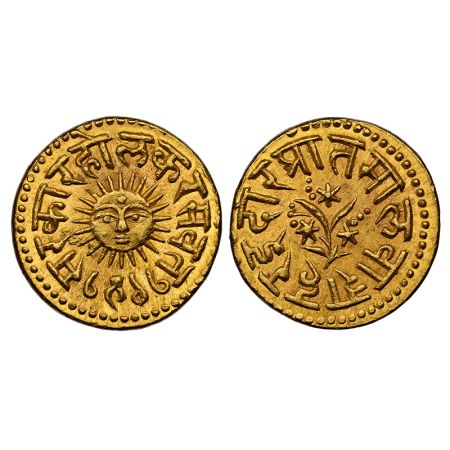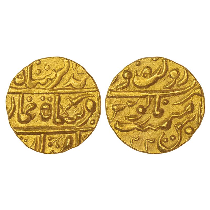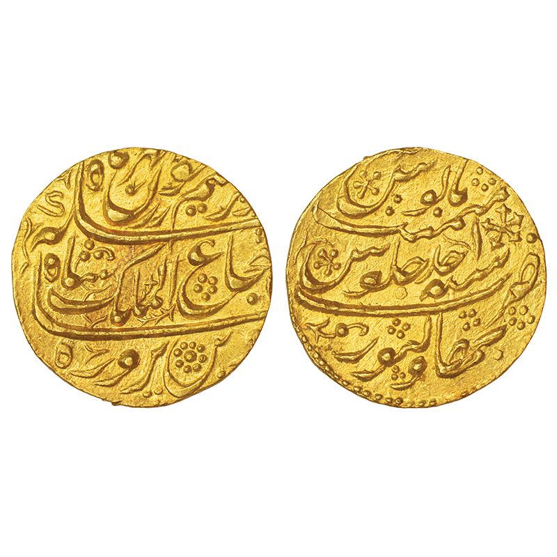 A gold issue of exceptional rarity, only two or three of these enigmatic gold mohurs are known to exist in collectors' hands. The VS date suggests the mohur was struck towards the end of the reign of Tukoji Rao II Holkar XI.