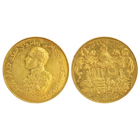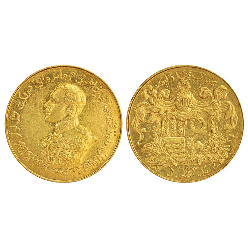 Bahawalpur, Sir Sadiq Muhammad Khan V (1907-1947 AD), gold ashrafi, Bahawalpur mint, AH 1343, KM Xm11, 5.93g. Obv: Portrait bust of Nawab Sadiq Muhammad Khan in military uniform facing left, Persian legend ba-Fazlah taalah Sadiq Mohammed Abbasi Khamis Farman Rawai mamlakat khudadad Bahawalpur. Rev: Ornate helmeted arms, Persian legend, Zarb Bahawalpur at top and Yek Ashrafi at bottom with date.