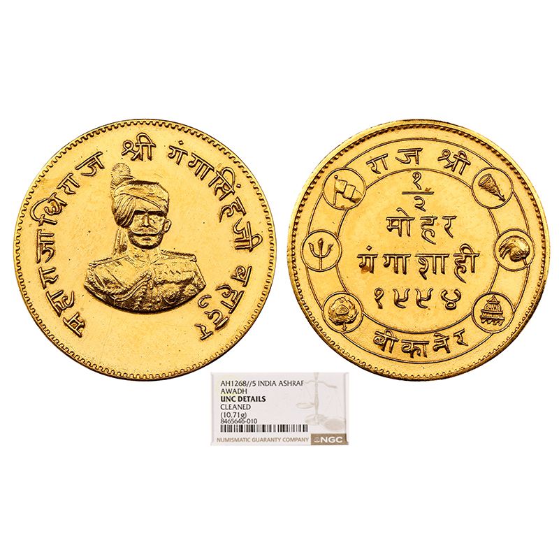 Bikaner, Ganga Singh (1887-1942 AD), gold 'Nazarana' ½ mohur, Proof restrike, VS 1994, Golden Jubilee of the ruler's reign issue, KM XM2, 4.39g. Obv: Bust of Maharaja Ganga Singh facing front, Devanagari legend Maharaja dhiraj Shri Ganga Singhji Bahadur around. Rev: Symbols of Royalty in small round circles surrounds denomination and date.