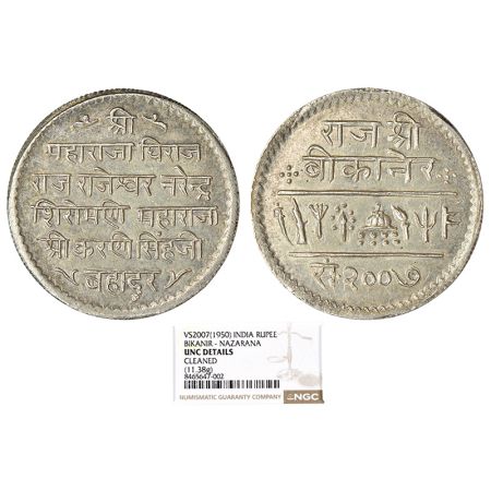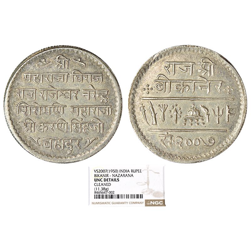 Bikaner - silver 'Nazarana' rupee, specially struck to mark the accession of Karni Singh (1950-1971), the last titular Maharaja, possibly struck locally at Bikaner, dated VS 2007, Zeno #329524, unpublished in major references, 11.35g. Obv: Nagari legend Shri Maharajadhiraja Rajarajeshvara Narendra Shiromani Maharaja Shri Karni Simha ji Bahadur within decorative scrolls. Rev: Raj Sri Bikaner in Nagari and a row of symbols - sword, shotgun, fly whisk, parasol, throne, trident pennant; VS 2007 below.