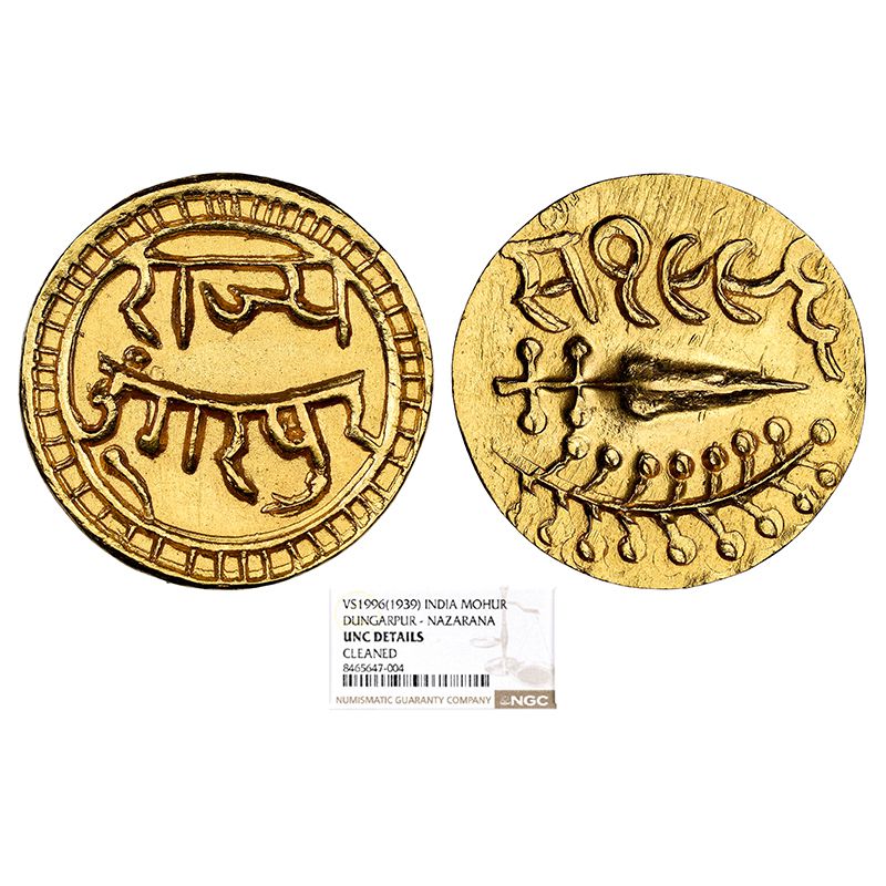 Dungarpur, Lakshman Singh (1918-1948 AD), gold 'Nazarana' mohur, VS 1996, KM 9, 11.00g. Obv: Devanagari legend Rajya Dungarpur within a double linear reeded border. Rev: Devanagari legend San 1996 above a dagger and a leafy scroll.