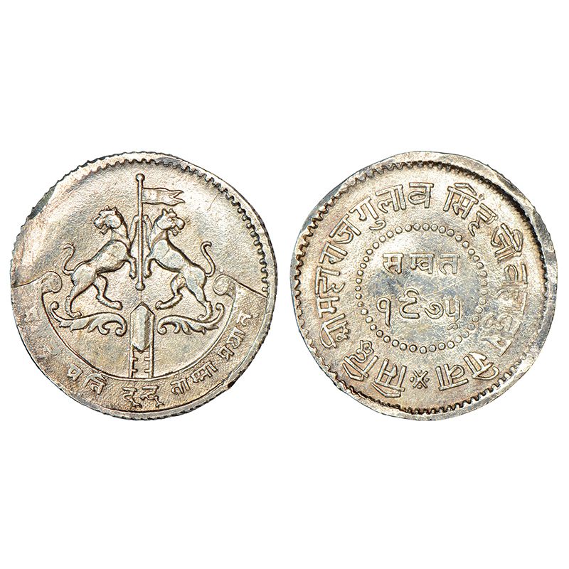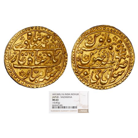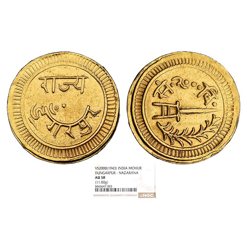 The practice of issuing special presentation coins, usually referred to by coin collectors as 'Nazarana', dates back to Mughal court rituals. For many princely states, these issues represented status, sovereignty and legitimacy. Jaipur took the tradition to another level. Gold Nazarana coins, by their very nature, are extremely rare. They were in all likelihood used by the high elites of the state.
