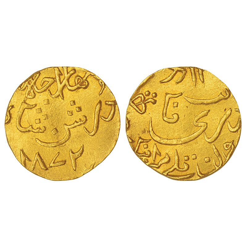 Awadh, Wajid Ali Shah (1847-1856 AD), gold ashrafi, Bait us-Sultanat Lakhnau Mulk Awadh Akhtarnagar mint, AH 1268/RY 5, KM 378, 10.71g. Obv: Persian legend sikka zad bar seem wa zar, az fazl tayeed-i ilah zille haque, wajid ali sultan alam Badshah with AH date. Rev: Parasol above crown, flanked by mermaids holding flag, crossed swords below; Jalus formula and Persian legend zarb Bait us Sultanat Lakhnau mulk Awadh Akhtarnagar with RY in margin.