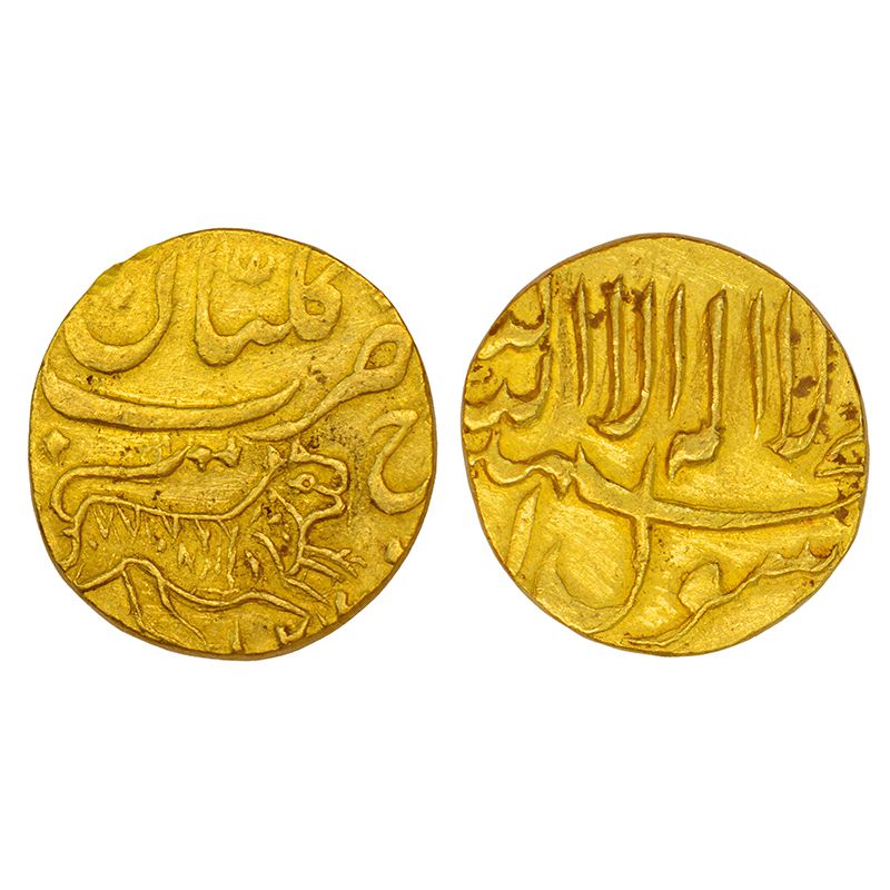 Awadh, Wajid Ali Shah (1847-1856 AD), gold ashrafi, Bait us-Sultanat Lakhnau Mulk Awadh Akhtarnagar mint, AH 1268/RY 5, KM 378, 10.71g. Obv: Persian legend sikka zad bar seem wa zar, az fazl tayeed-i ilah zille haque, wajid ali sultan alam Badshah with AH date. Rev: Parasol above crown, flanked by mermaids holding flag, crossed swords below; Jalus formula and Persian legend zarb Bait us Sultanat Lakhnau mulk Awadh Akhtarnagar with RY in margin.