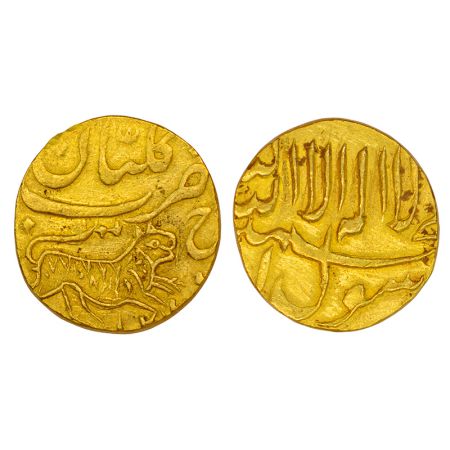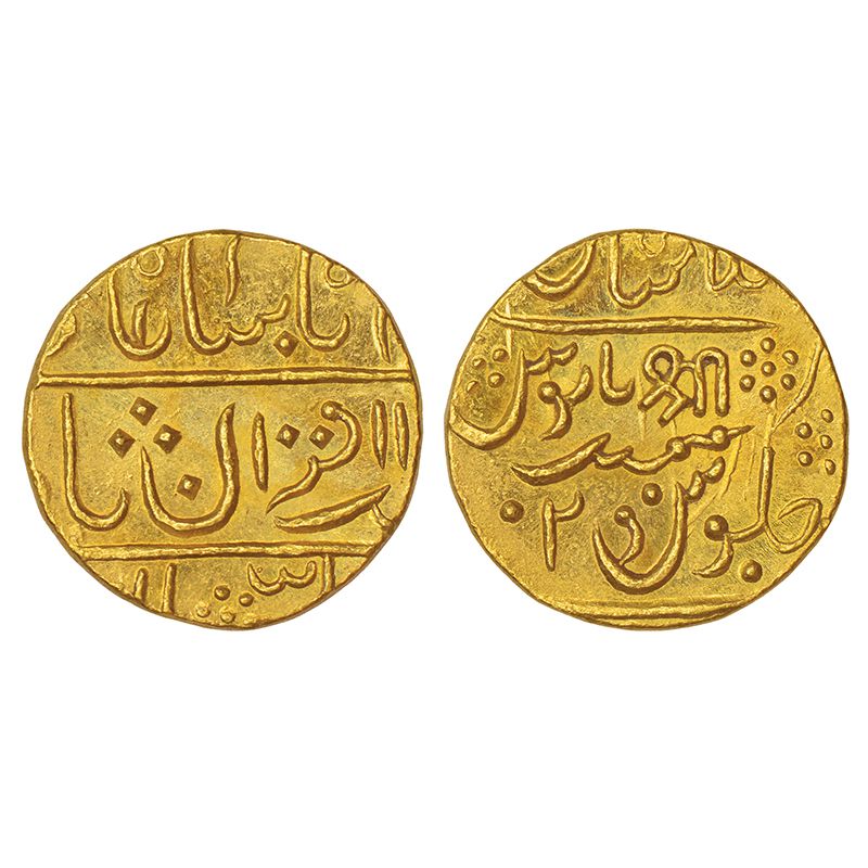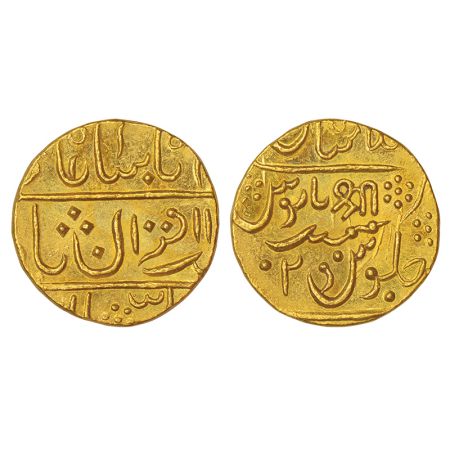 Bahawalpur, Muhammad Bahawal Khan II (1778-1809 AD), gold 'Nazarana' mohur, Bahawalpur mint, in the name of Shah Shuja'a al-Mulk of Afghanistan, RY Ahd, 11.05g. Obv: Couplet, Sikka zad bar Seem wa Zar chun Mihr wa Mah / Shah-I deen Parwar Shuja'a ul-Mulk Shah. Rev: Mint-name, RY and Jalus formula.