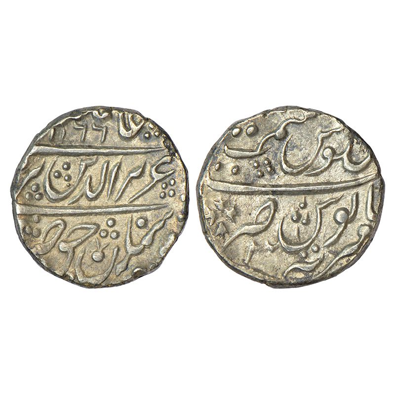 The date on the coin and the RY do not match if the date is taken to be in AH. Alamgir II's accession took place in AH1167, so Ah1166 cannot be correct. RY 3 would correspond to 11.05.1756 - 30.04.1757. If that is correct, the coin must have been issued soon after Merta was handed over, in accordance with the treaty of Nagore of 2nd February 1756, to Bijay Singh of Jodhpur.