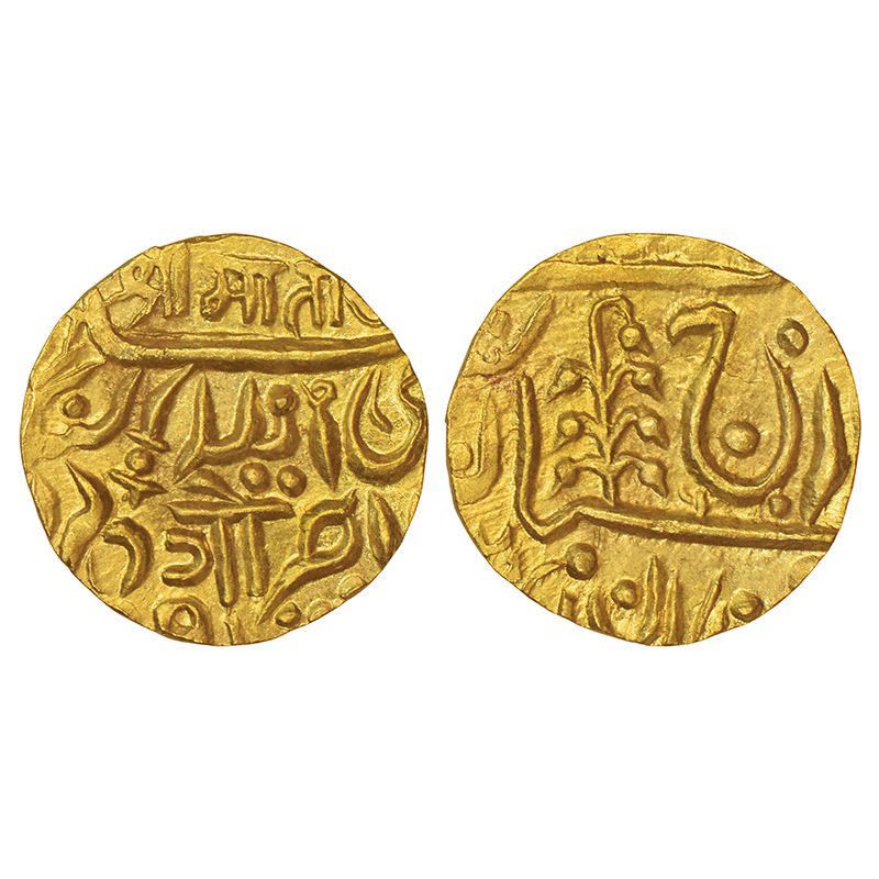 Awadh, Wajid Ali Shah (1847-1856 AD), gold ashrafi, Bait us-Sultanat Lakhnau Mulk Awadh Akhtarnagar mint, AH 1268/RY 5, KM 378, 10.71g. Obv: Persian legend sikka zad bar seem wa zar, az fazl tayeed-i ilah zille haque, wajid ali sultan alam Badshah with AH date. Rev: Parasol above crown, flanked by mermaids holding flag, crossed swords below; Jalus formula and Persian legend zarb Bait us Sultanat Lakhnau mulk Awadh Akhtarnagar with RY in margin.