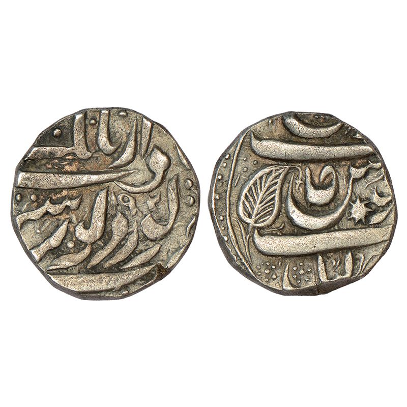 Nabha - silver 'Nazarana' rupee of Hira Singh (1871-1911 AD), 'Nābh Kamal' mint, VS 192X, not listed in Herrli, 10.98g. Obv: 'Gobindshahi' couplet partly visible: Deg tegh fateh nusrat be-dirang yaft az nanak guru Gobind singh (Abundance, power and victory [and] assistance without delay, are the gift of Nanak [and] Guru Gobind Singh). Rev: 'Julus’ formula with letter 'Suad' in the Seen of Julus, and a beautiful leaf mark to left and a star to right in second line.
