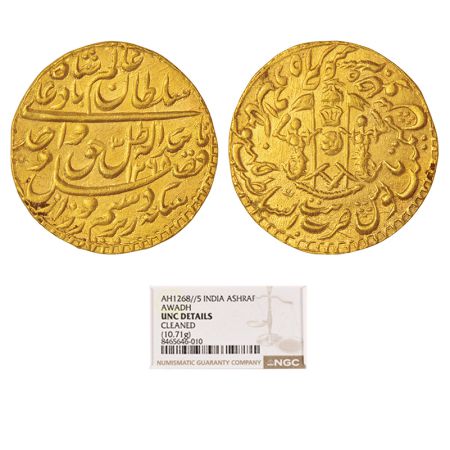 Awadh, Wajid Ali Shah (1847-1856 AD), gold ashrafi, Bait us-Sultanat Lakhnau Mulk Awadh Akhtarnagar mint, AH 1268/RY 5, KM 378, 10.71g. Obv: Persian legend sikka zad bar seem wa zar, az fazl tayeed-i ilah zille haque, wajid ali sultan alam Badshah with AH date. Rev: Parasol above crown, flanked by mermaids holding flag, crossed swords below; Jalus formula and Persian legend zarb Bait us Sultanat Lakhnau mulk Awadh Akhtarnagar with RY in margin.