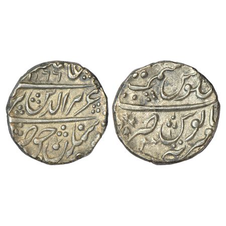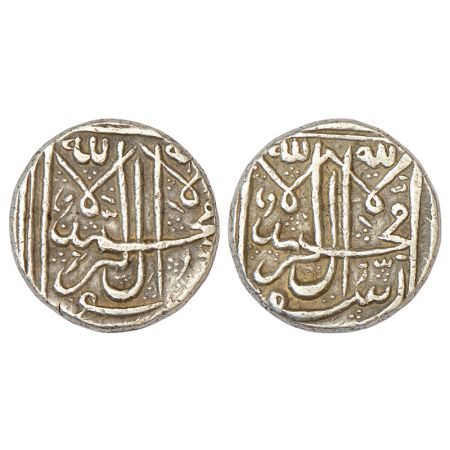 The handsome issues of Kalyani were struck for a short while in early 19th century, probably to celebrate the Nawab's wedding to Sahibzadi Bakhatwar Begum, the granddaughter of Nizam ul-Mulk Safa Jah I. Their design is unusual - without the mention of the Mughal emperor and featuring the Kalima instead.