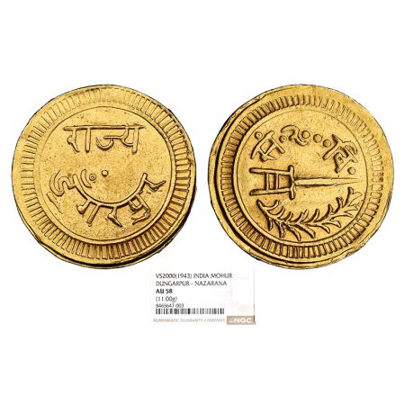 Dungarpur, Lakshman Singh (1918-1948 AD), gold 'Nazarana' mohur, VS 2000, unlisted in KM, 11.00g. Obv: Devanagari legend Rajya Dungarpur within a double linear reeded border. Rev: Devanagari legend San 2000 Vi at top, katar at center with a leaved branch in the bottom within a double linear reeded border.