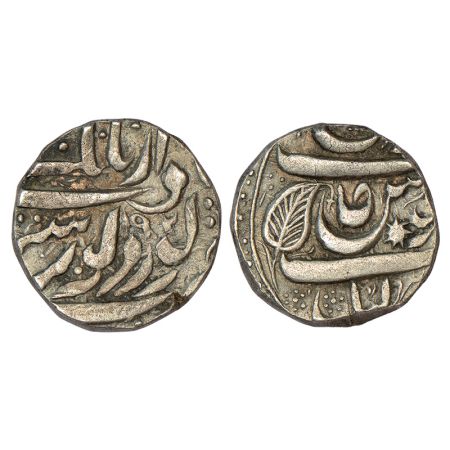 Nabha - silver 'Nazarana' rupee of Hira Singh (1871-1911 AD), 'Nābh Kamal' mint, VS 192X, not listed in Herrli, 10.98g. Obv: 'Gobindshahi' couplet partly visible: Deg tegh fateh nusrat be-dirang yaft az nanak guru Gobind singh (Abundance, power and victory [and] assistance without delay, are the gift of Nanak [and] Guru Gobind Singh). Rev: 'Julus’ formula with letter 'Suad' in the Seen of Julus, and a beautiful leaf mark to left and a star to right in second line.