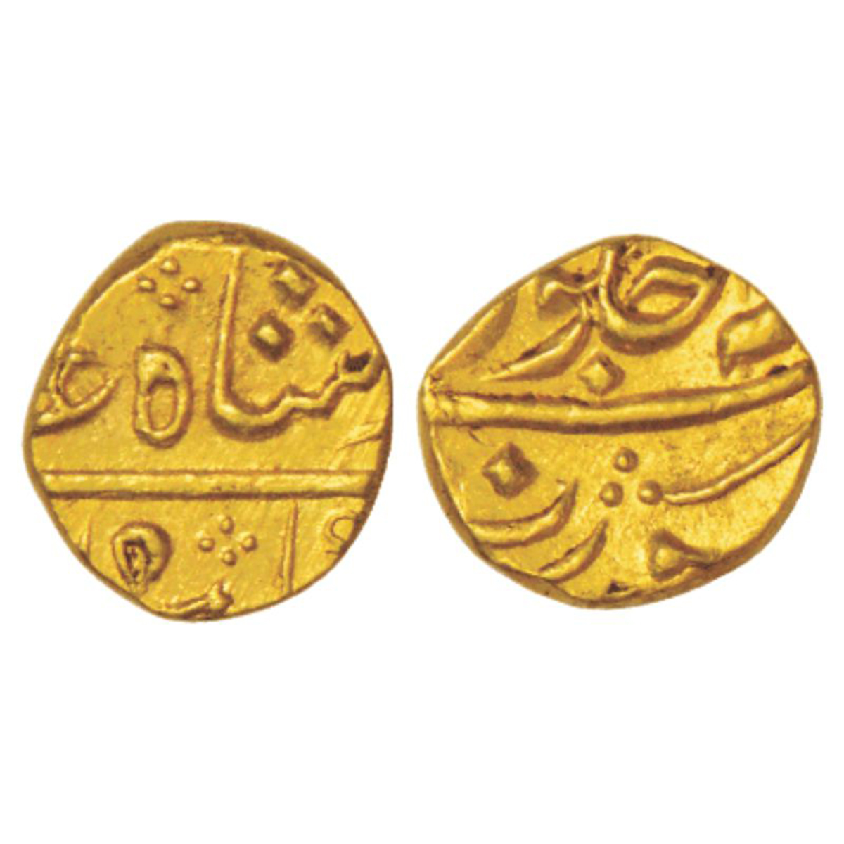 Bengal Presidency, Murshidabad mint, gold ¼ mohur, in the name of Shah Alam II, AH 1204/RY 19, edge gained right, Stevens EIC 4.7: PR 64, 3.09g. Obv: Persian legend Sikka Shah Alam Badshah Ghazi and AH date. Rev: Jalus formula with Persian legend Sanah 19; zarb Murshidabad.