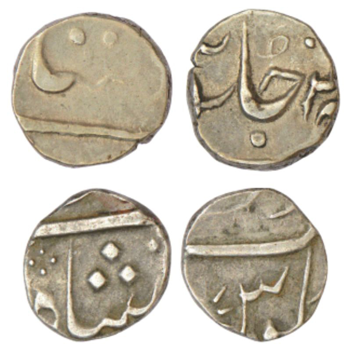 Bombay Presidency, Surat mint, silver coins (2), in the name of Shah Alam II. (A) ¼ rupee, RY 4x, Stevens EIC 6.172, 2.85g. (B) 1/8 rupee, privy mark 1, Stevens EIC 6.173, 1.42g.