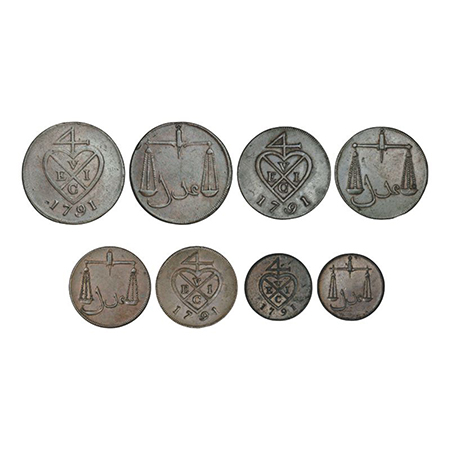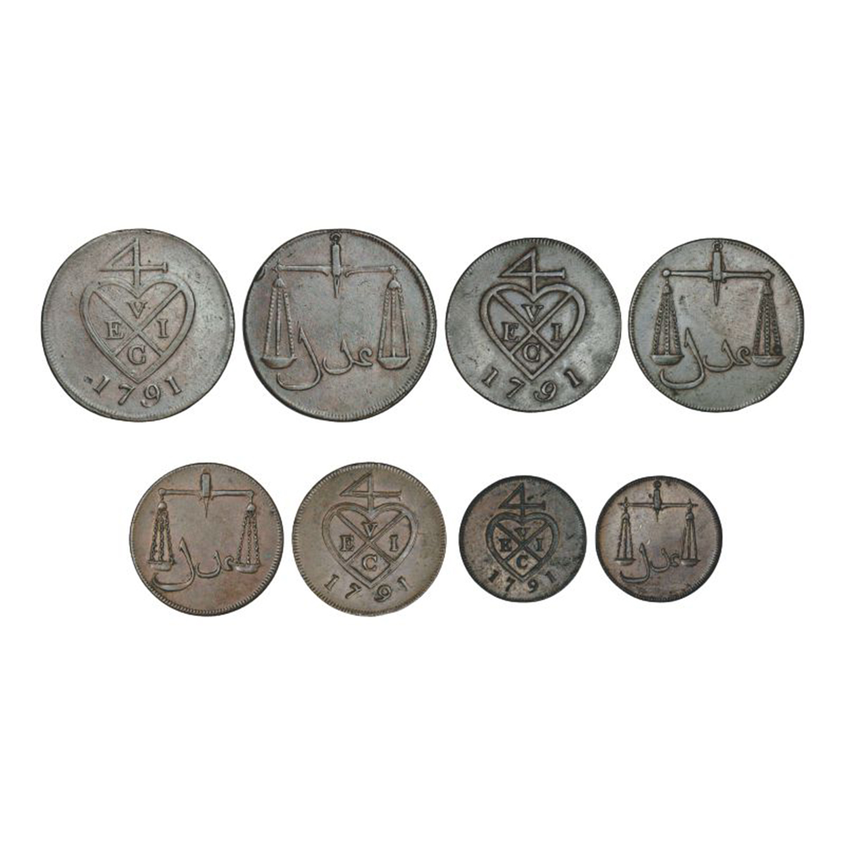 Bombay Presidency, Soho mint, set of 4 copper coins, AD 1791, 2 pice, Stevens EIC 8.2-8.3, 13.05g, 1½ pice, Stevens EIC 8.16-8.17, 1 pice, Stevens EIC 8.22-8.28, 6.43g and ½ pice, Stevens EIC 8.34-8.44, 3.38g. Obv: Bale mark with date below. Rev: Scales and Persian 'Adil' below. (4 coins)