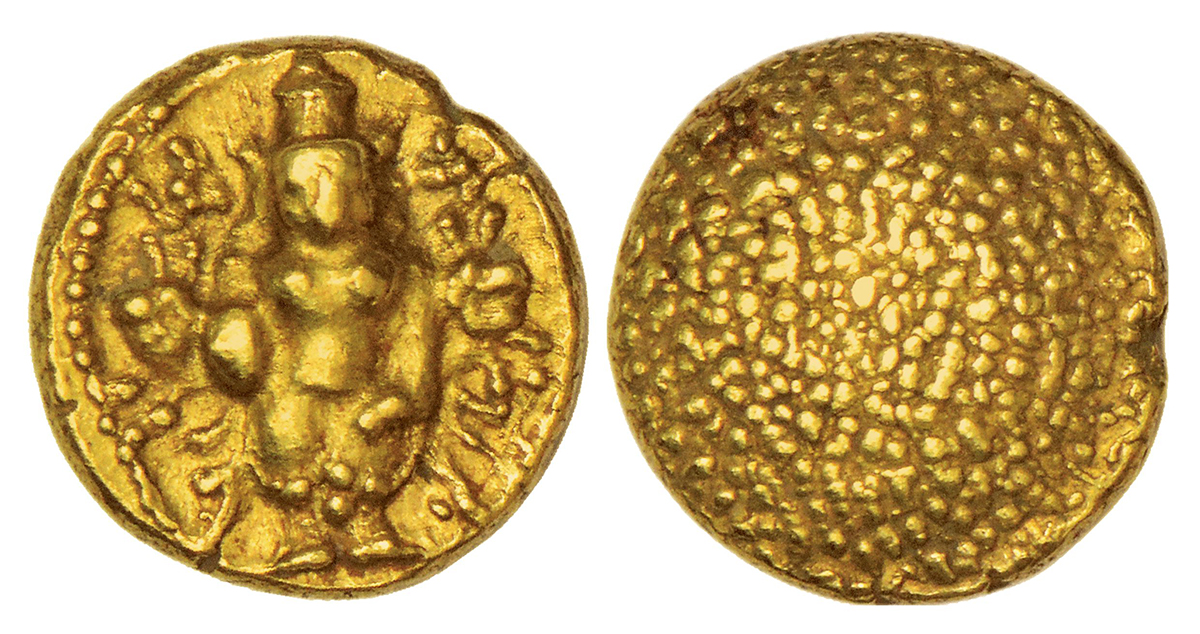 Madras Presidency, Madras mint, early coinage, gold pagoda, ND (1678-1740 AD), Stevens EIC 1.2; PR 2, 3.44g. Obv: Standing figure of Lord Vishnu. Rev: Granulated.