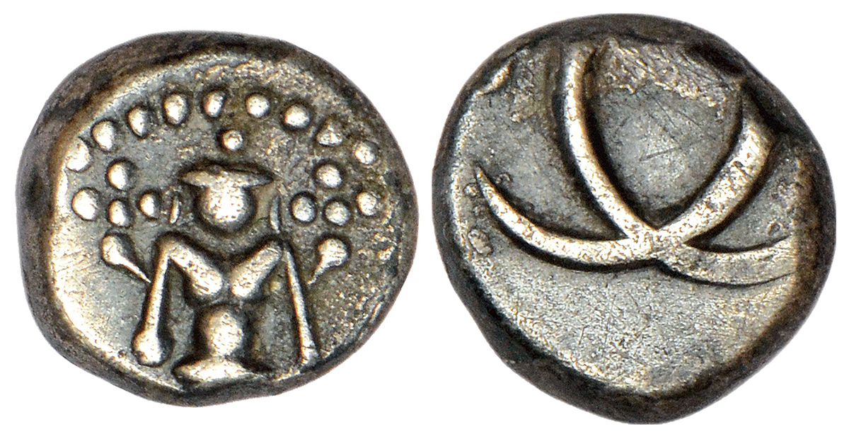 Madras Presidency, Madras mint, early coinage, silver 2 fanam, ND (1764-1806 AD), Stevens EIC 1.24, 1.78g. Obv: Standing figure of Lord Vishnu. Rev: Two interlinked C's.
