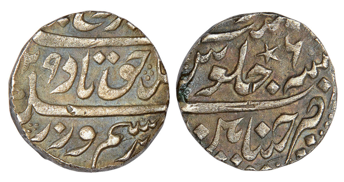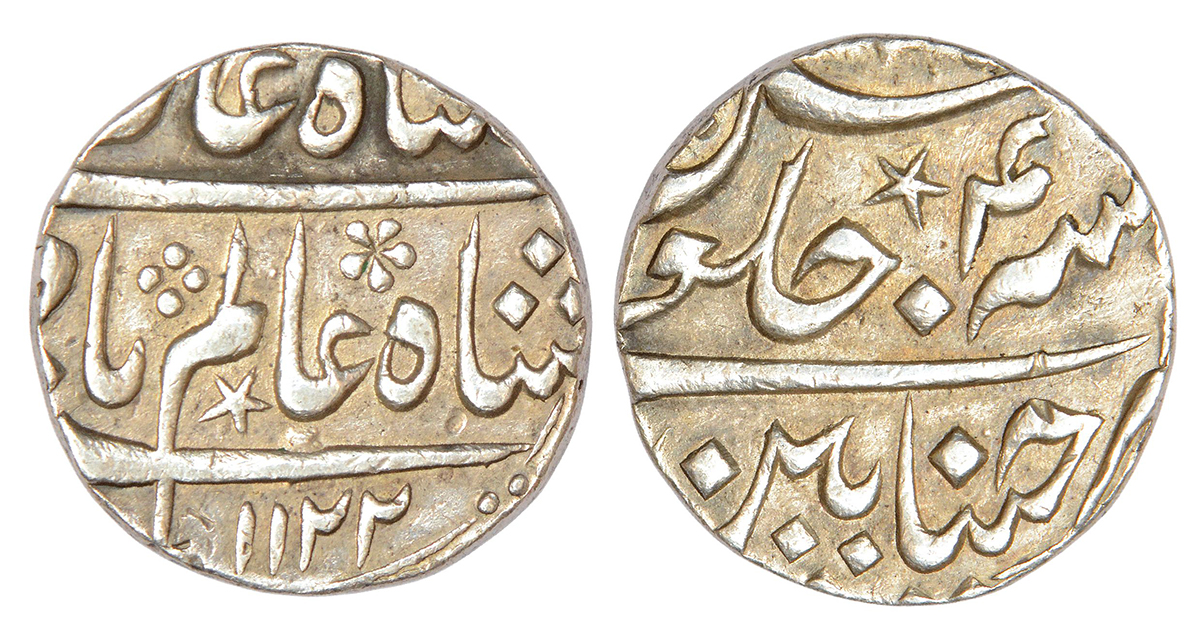 Madras Presidency, Chinapattan mint, Mughal style, silver rupee, in the name of Shah Alam Bahadur, AH 1122/RY 4, star mintmark on both sides, Stevens EIC 2.18; PR 122, 11.55g.
