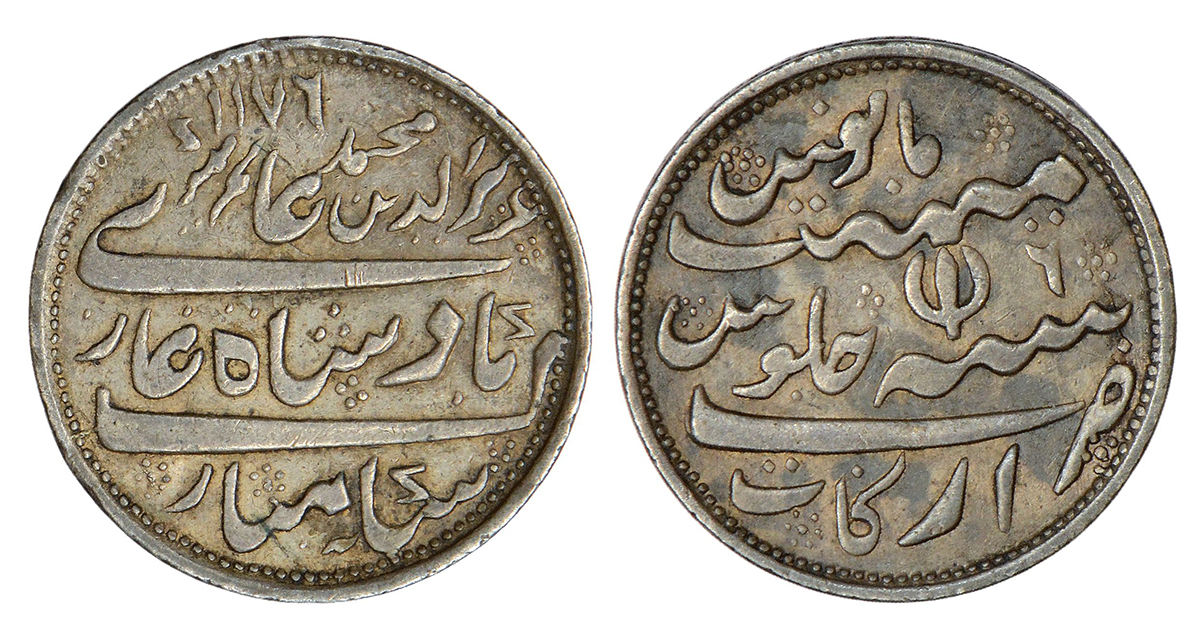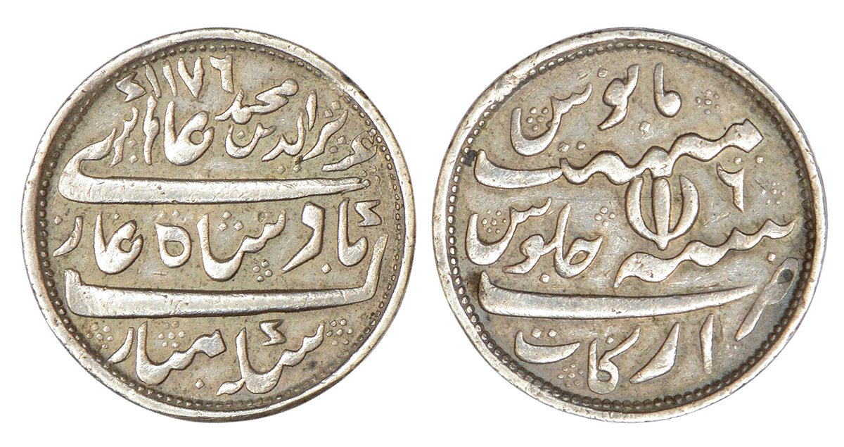 Madras Presidency, Arkat mint, later coinage, silver ½ rupee, in the name of Alamgir II, AH 1176 (error for 1172)/RY 6, open lotus type, Stevens EIC 4.15; PR 254, 5.79g. Obv: Persian legend Sikka mubarak Badshah Ghazi Aziz ud din Muhammad Alamgir and AH date. Rev: Persian legend Zarb Arkat Sanah 19 Julus maimanat manus.